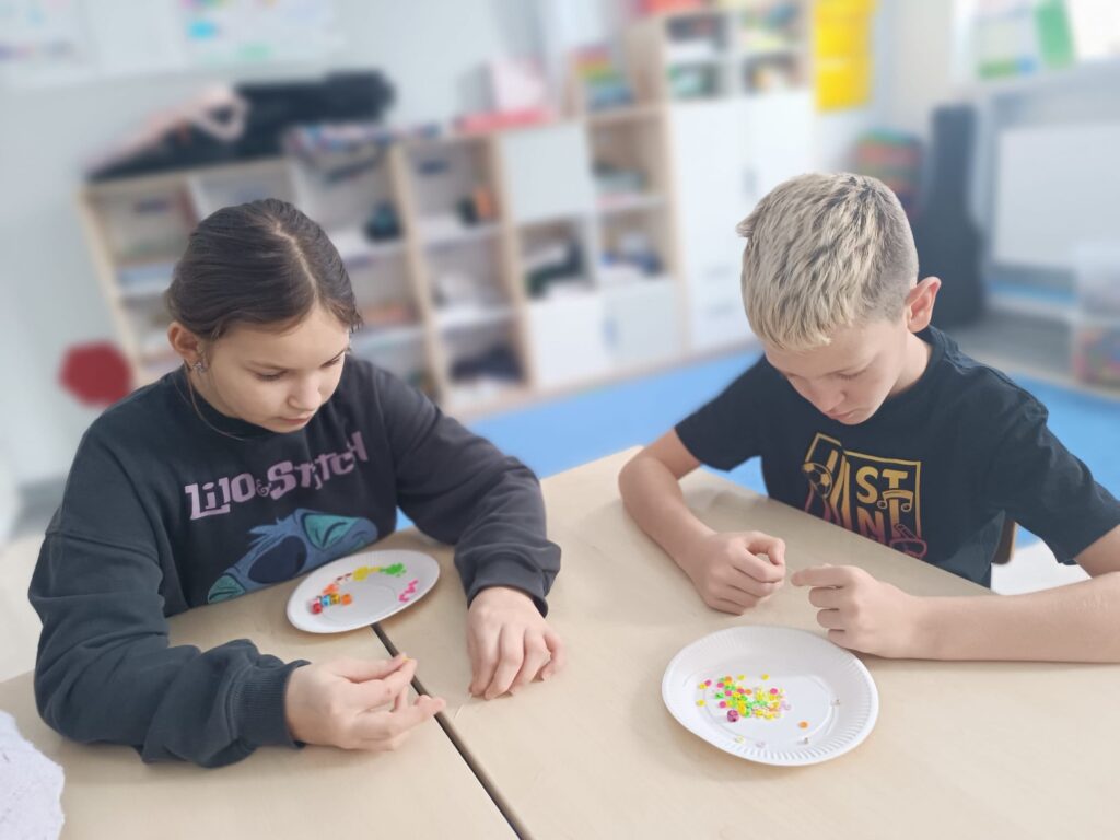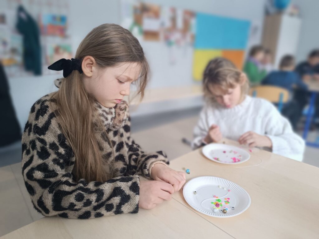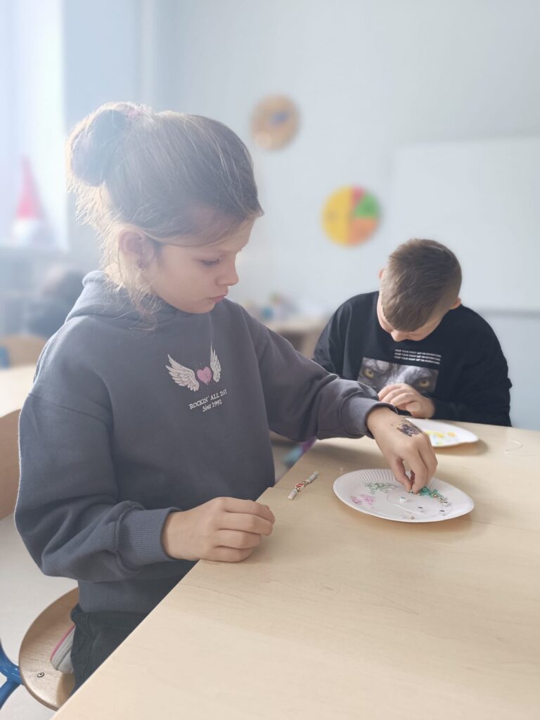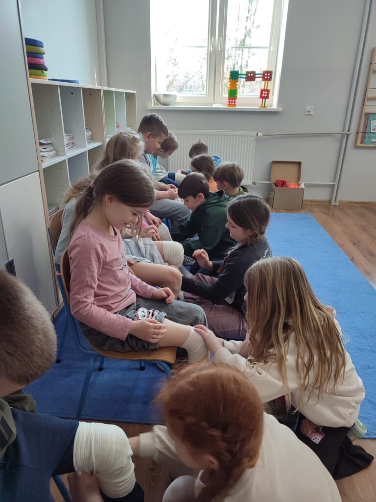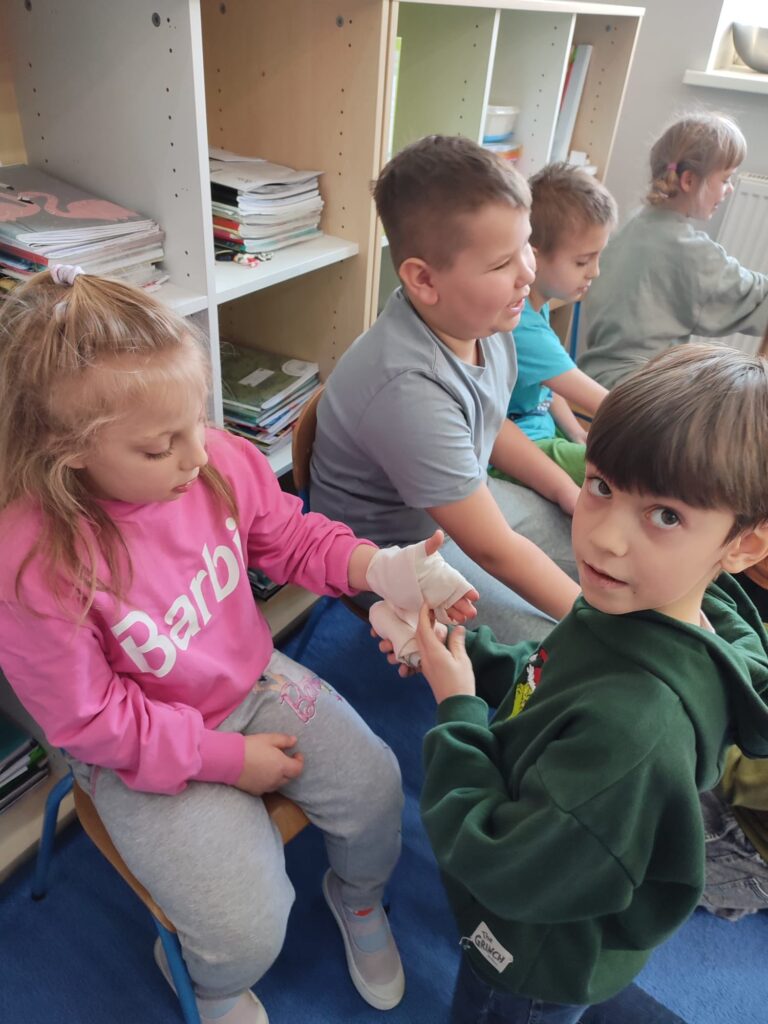 Rozpoczął się też projekt „Pierwsza pomoc” – klasa druga uczyła się zakładać bandaż na kolano i rękę.